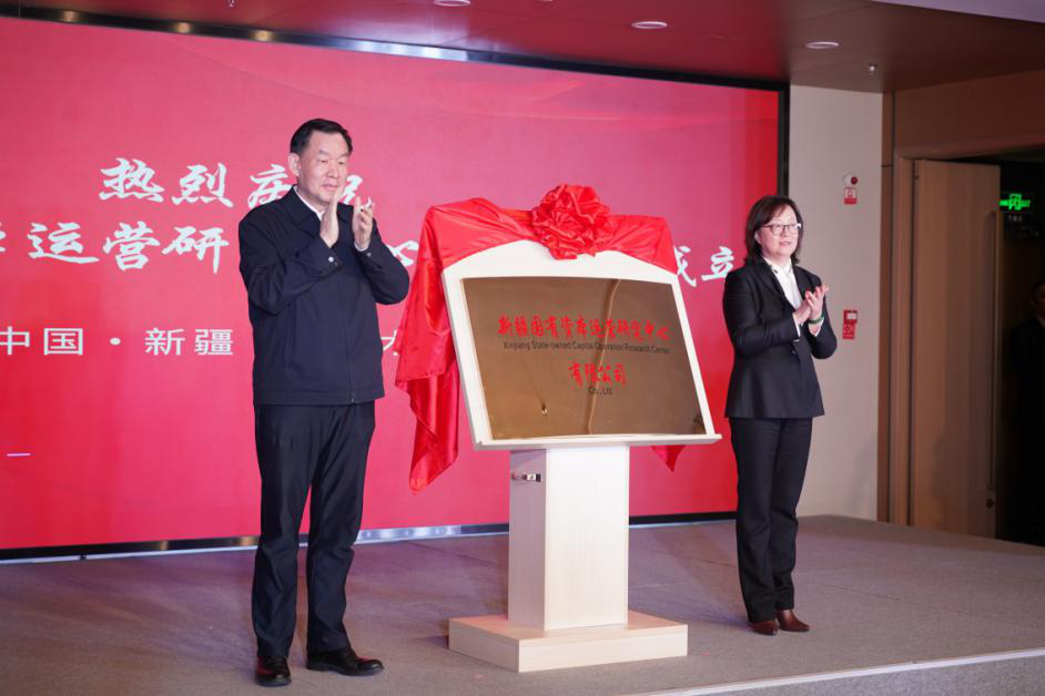 图为:四虎影院 党委书记、副主任胡开江和新疆金投党委书记、董事长黄新丽为新疆国有资本运营研究中心有限公司揭牌