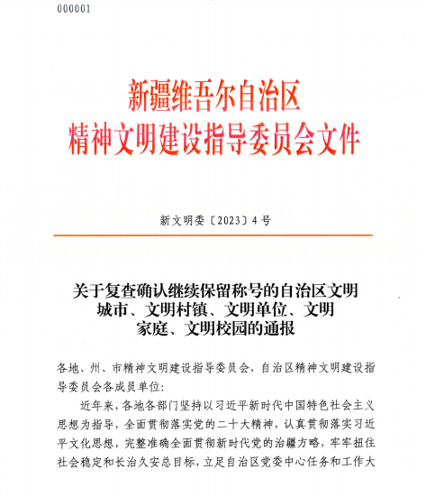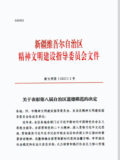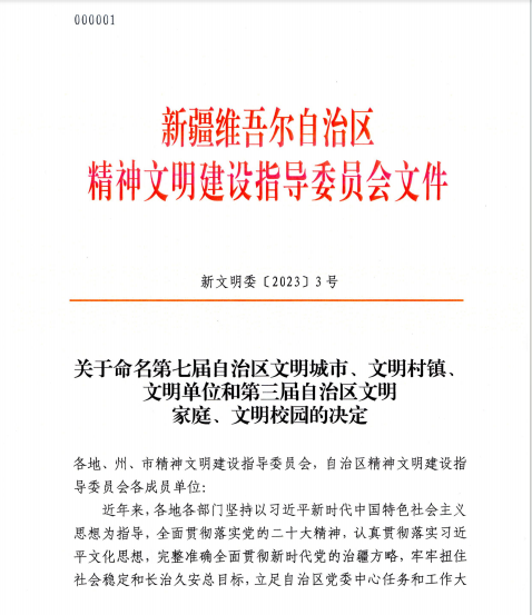 近日,自治区精神文明建设指导委员会印发了《关于命名第七届自治区文明城市、文明村镇、文明单位和第三届自治区文明家庭、文明校园的决定》《关于复查确认继续保留称号的自治区文明城市、文明村镇、文明单位、文明家庭、文明校园的通报》《关于表彰第八届自治区道德模范的决定》,国资系统59家企业继续保留自治区文明单位称号,2户家庭继续保留文明家庭称号。7家企业被授予第七届自治区文明单位称号,1户家庭被授予第三届自治区文明家庭称号,1名个人被授予第八届自治区道德模范称号。