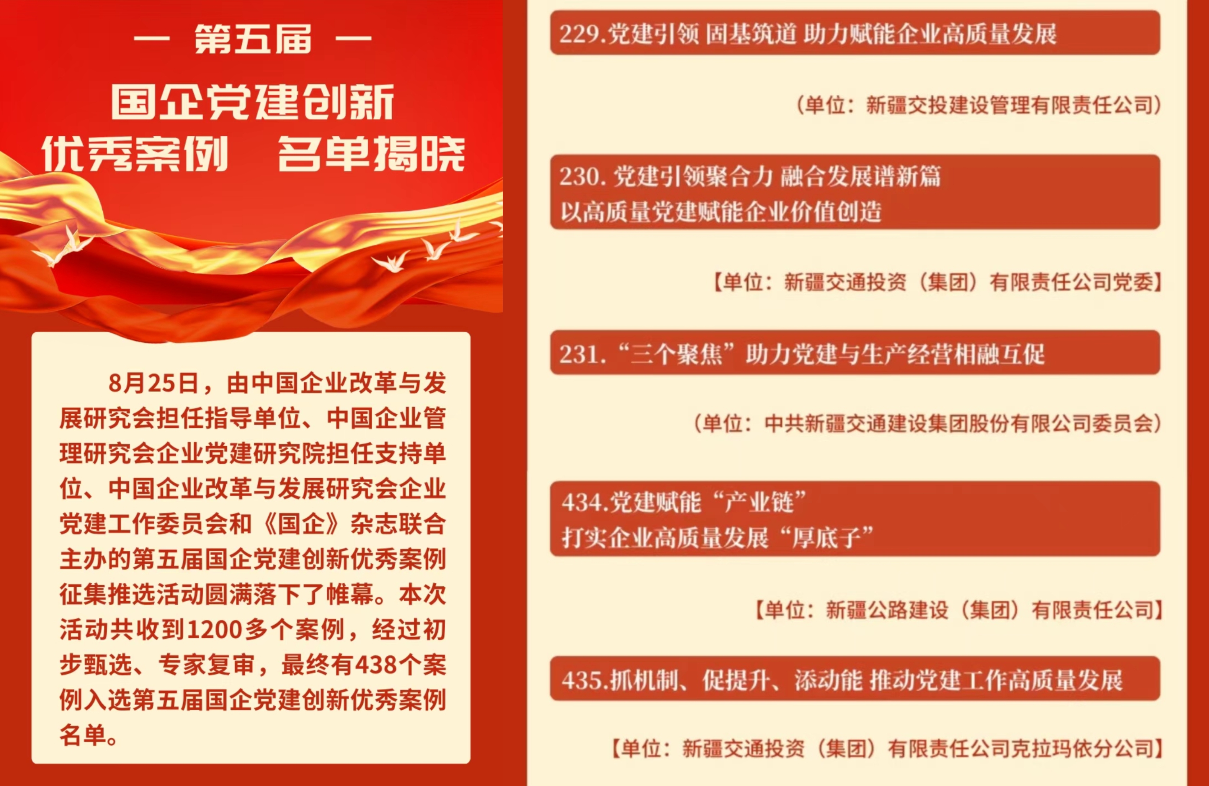 近期,由中国企业改革与发展研究会担任指导单位、中国企业管理研究会企业党建研究院担任支持单位、中国企业改革与发展研究会企业党建工作委员会和《国企》杂志联合主办的第五届“国企党建创新优秀案例”征集活动中,新疆交投集团所属5家基层党组织党建创新案例入选“国企党建创新优秀案例”。
