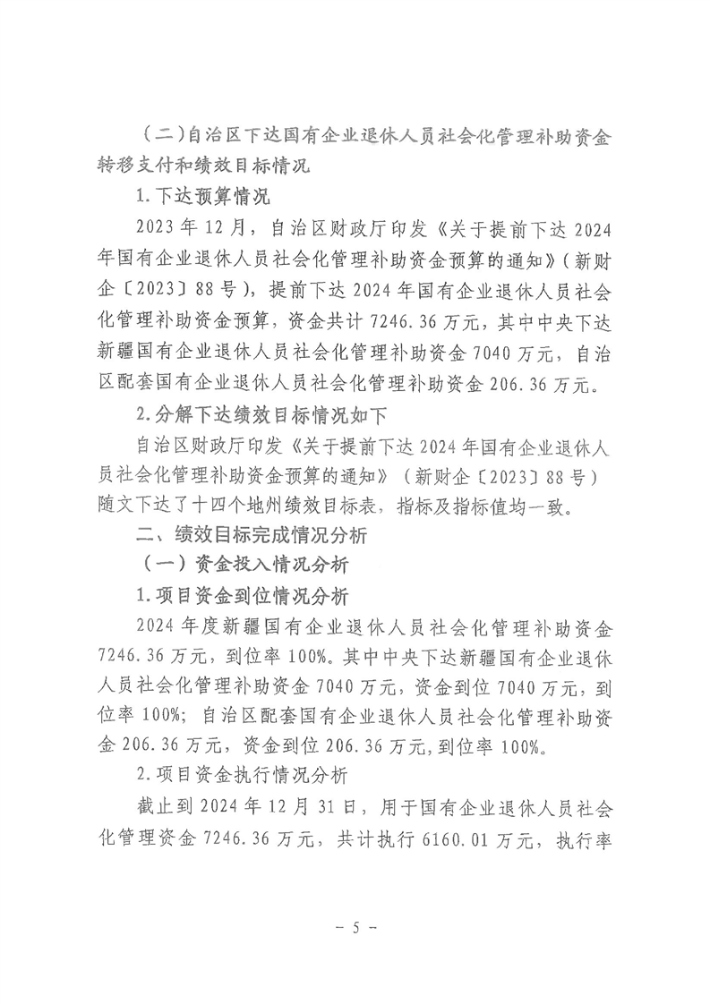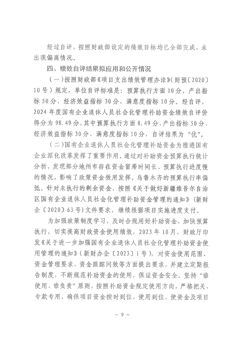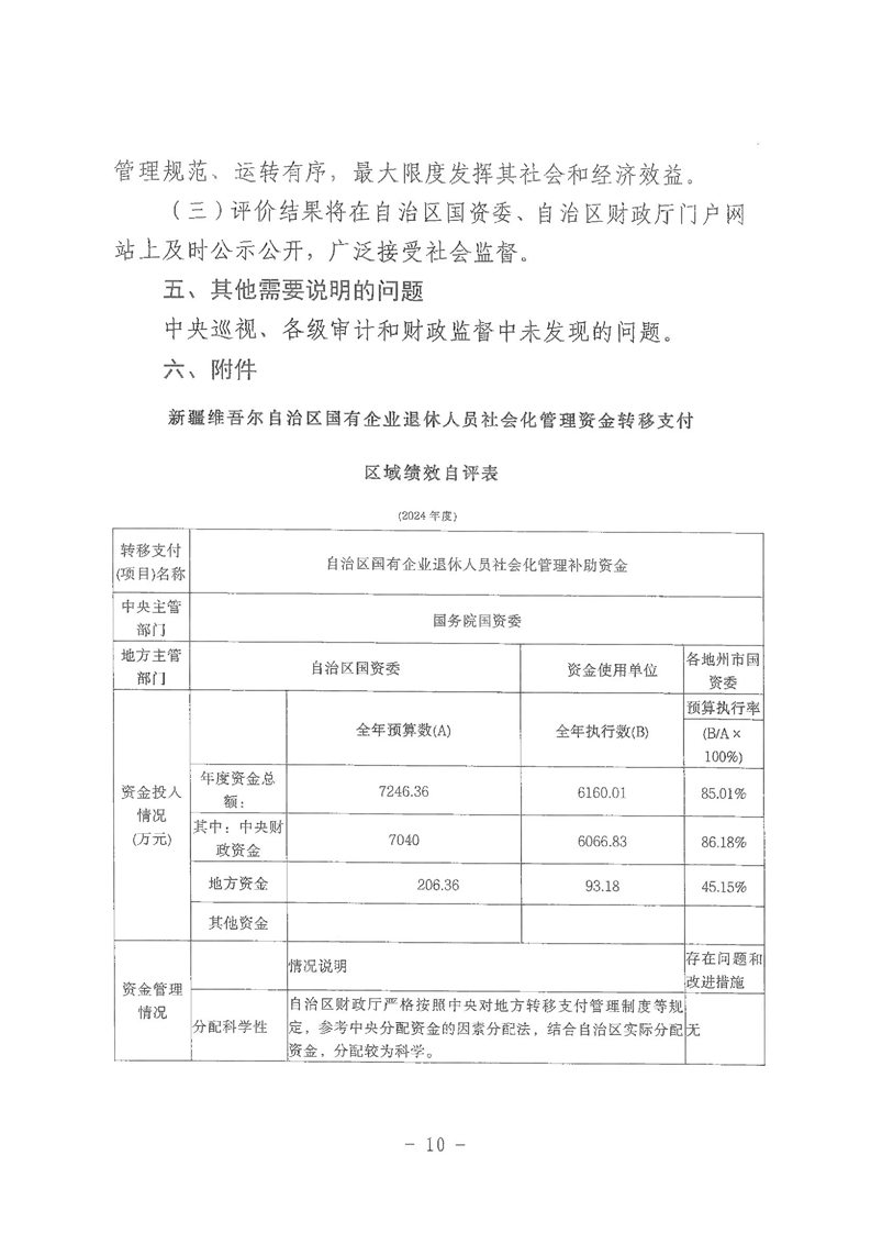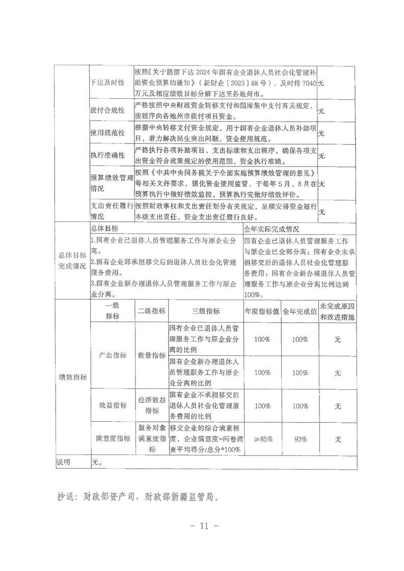 新疆国有企业退休人员社会化管理补助中央专项转移支付绩效自评报告(2024年度)